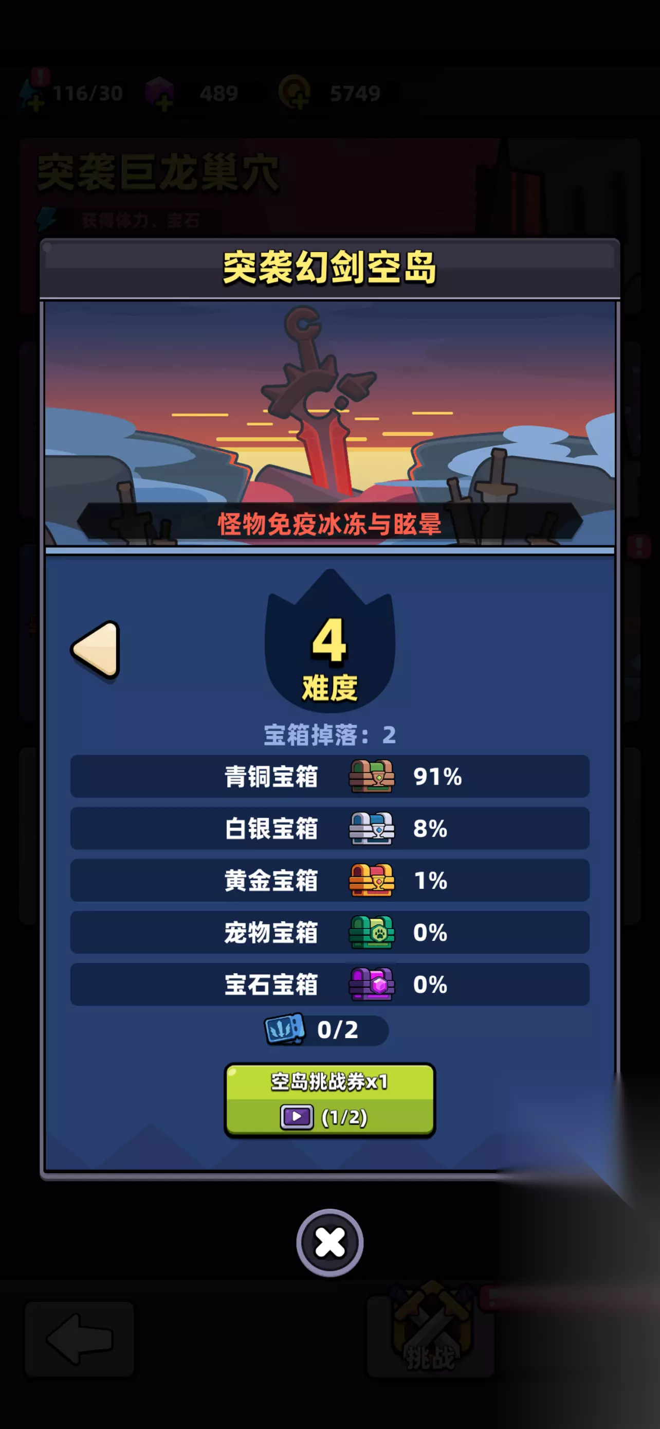 该游戏的活动中分为挑战和副本,而副本目前已经解锁了三个:巨龙巢穴作为通关第二章节就可以解锁的首先是最简单的,可以获得体力和宝石;星界树需要通关第三章节,可以获得宠物粮和宠物蛋;而空岛则可以随机获得不同等级的宝箱,当然难度越高的话宝箱的等级也就越高。