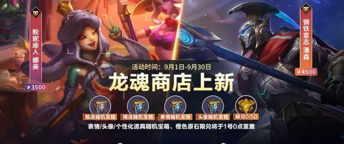9月龙魂商店轮换上线!9月1日-9月30日活动期间,召唤师可使用龙魂水晶*3500兑换鲛妮座人 娜美,使用龙魂水晶*4500兑换钢铁意志 潘森,同时还有新一轮的橙色原石*50可供兑换~