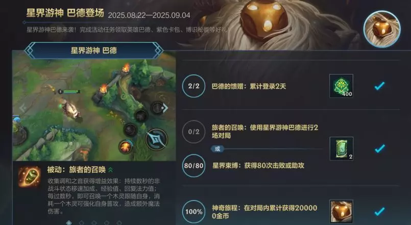 星界游神 巴德来袭!截止至9月4日,召唤师完成任务即可领取新英雄星界游神 巴德、传奇图集紫色卡包、博识秘能*400等好礼~