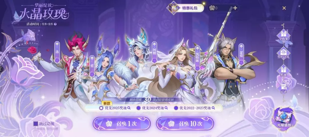 ● 水晶玫瑰舞会即将结束,参与活动召唤不同水晶玫瑰奖池,即有机会获得水晶玫瑰限定皮肤等好礼~