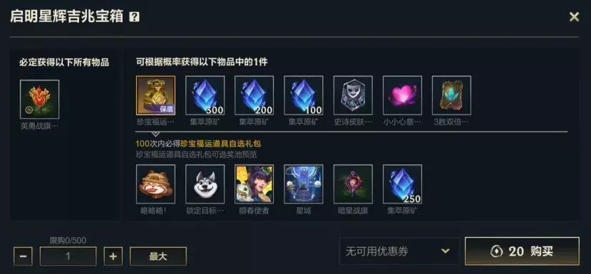 截止至9月3日,召唤师购买启明星辉吉兆宝箱,就有机会获得首发动态表情-略略略!、动态头像-撷春使者、英勇战旗-暗星战旗等好礼~开启100次至少获得1个珍宝福运道具自选礼包!