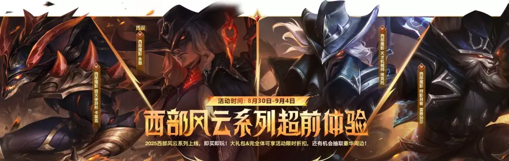 即日起,截止至9月4日22:59,西部风云系列新皮肤超前体验开启!传说皮肤-西部魔影 永恩、西部魔影 天才机械师 维克托、西部魔影 狩影异客 雷恩加尔、西部魔影 猎天使异形 卡兹克帅气登场,传说皮肤超炫特效!上线即买即玩,大礼包和完全体礼包限时折扣,参与还有机会抽豪华周边~
