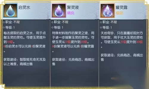图3 启灵之水 激活潜能 江湖中,天地灵气凝结幻化出的启灵之水,可用于提升玉灵等级。以日月精华贯穿武者躯体,激活隐藏潜能,助其实力飞升。启灵水可通过无双以上难度的“智取姬无命”副本获得,随培养次数递增,要兑换更高级别的启灵物品才可继续升级。 【策略培养 成长之路自主掌控】
