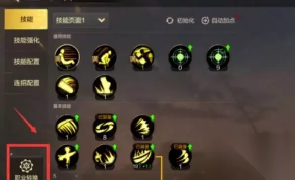 2、进入技能栏后,在左下角选择转职,这是一件很简单的事情。