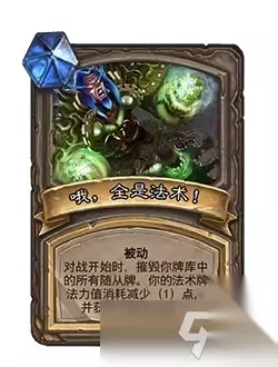 哦,全是法术! 对战开始时,摧毁你牌库中的所有随从牌。你的法术牌法力值消耗减少(1)点,并获得+2法术伤害。