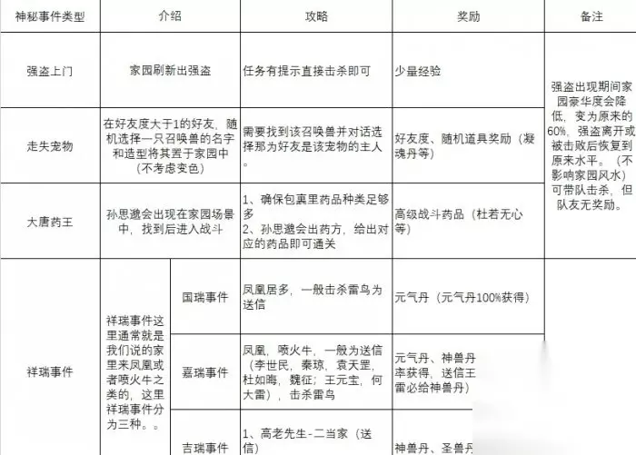 这里还有一点需要注意,如果玩家家园风水值不好,可以通过算卦来改变家园当日运势,仅仅是当日。 这里的算卦如果总是要不到上签不妨买一些家具增加风水。这样触发神秘事件的概率就会大大增加,算卦每日有5次机会,不出意外总会有那么一次中奖的。 二、下面来说一下触发家园神秘事件都会遇到的类型 常规的神秘事件类型总计有4种,但是我们常见的也就只有强盗和祥瑞事件了。