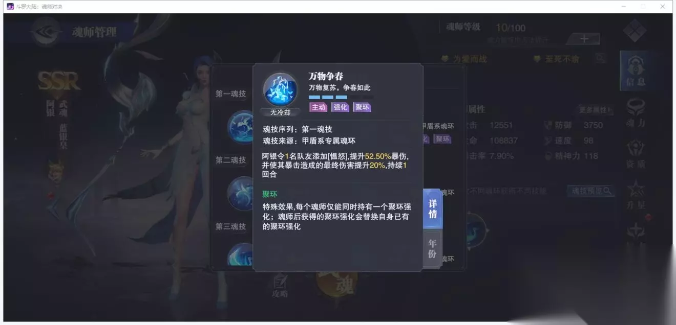 生命之神阿银的强度体现在多功能性上,既能作为长图增伤核心,也可在PVP中通过护盾与免疫效果反制爆发阵容。其培养优先级取决于团队需求,若已拥有SP尘心、SP千仞雪等主C,阿银的辅助价值将大幅提升。资源有限时可优先提升2、4魂环年限,并搭配精神类神佑属性,确保控制命中率与护盾强度。