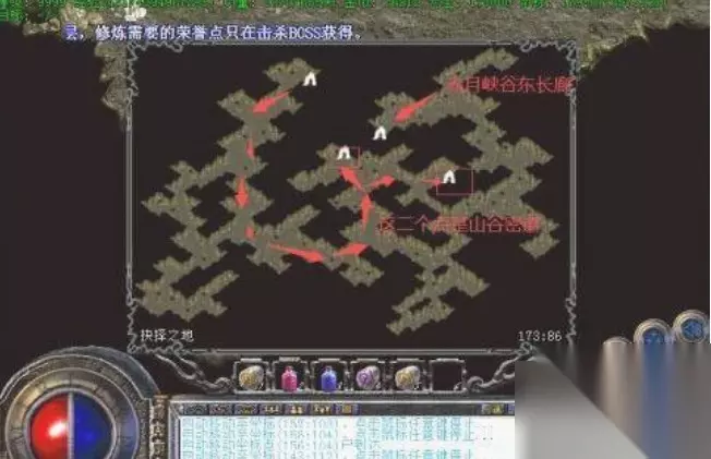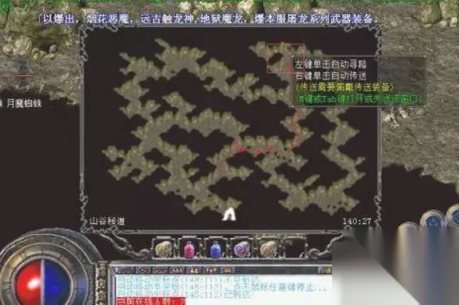 2、进入山谷密道后打开地图不显示入口了。是我版本没更新呢还是什么情况,这里要根据坐标定位。有二个坐标。一个是通往恶魔祭坛的180 54。一个是通往赤月老巢的139 25。我们要去赤月老巢。这里有我们向往的装备。139.25出发。