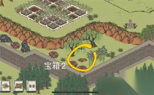 宝箱2:草药田附近,需要先擦拭右边的石碑,即可出现石梯通向宝箱(在茂盛草药田采集八次)。奖励内容是金矿×10,铜钱6888。