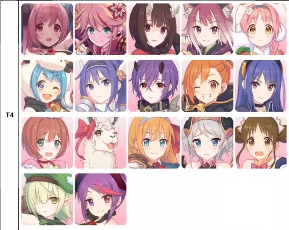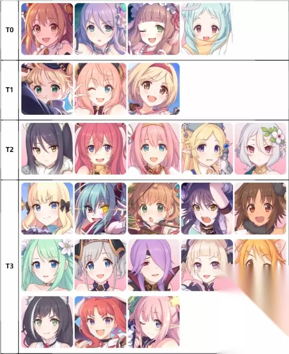 T0:望,静流,真步,宫子(1) T1:莫妮卡,铃奈(2),吉塔 T2:栞(3),空花(4),优衣(5),优花梨(6),可可罗(7) T3:咲恋,杏奈(8),璃乃,真琴(9),香织(10),千歌(11),茜里,深月,雪(12),日和,凯留,秋乃,初音 T4:依绪,妮侬,恵理子,珠希,美美,真阳,美冬,忍,未奏希,怜,胡桃,莉玛,佩可,依里,铃莓,碧,美咲 【注1】萌新之友,自回血ub、skill2,无敌skill1,超高的闪避,唯一的缺点是2星,面板较低。 【注2】开服前期最强输出,越到后面强度越低,和栞相反。 【注3】和铃奈相反,越到后面强度越高。 【注4】前期练度低、星级低的时候,嘲讽容易导致暴毙。 【注5】前期群奶奶量不高,Normal 7-3出现雷云后T1,低配过vh塔需要。 【注6】ub魔法盾,skill1回血,skill2回技能值,完美的辅助。 【注7】Normal 4-5左右开始会有专打中排的怪,ub大量自回血,无可替代。 【注8】开ub后双抗清零,容易暴毙。 【注9】站位过于靠前,不适合推图,公会战T0角色。 【注10】站位过于靠前。 【注11】ub召唤物会给boss送技能值,Normal 7-3出现雷云后T2,低配过vh塔需要。 【注12】skill2充技能值。