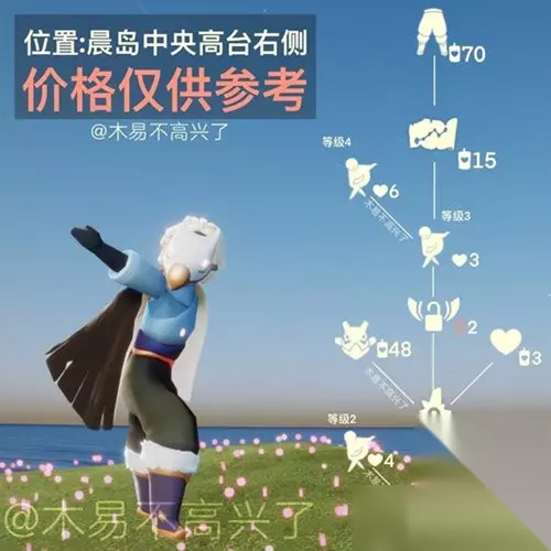 光遇5月19号复刻先祖攻略 一、自拍先祖复刻兑换表 1、毛靴棉裤,兑换需要70白蜡烛。 2、弯喙面具,兑换需要48根白蜡烛。 3、一张乐谱,兑换需要15根白蜡烛。 4、随机魔法,兑换需要10根白蜡烛。 5、永久光翼,解锁需要2根升华蜡烛。 6、自拍动作,升级需要13颗爱心。 7、兑换总计需要141白蜡烛,2红蜡烛,13爱心。
