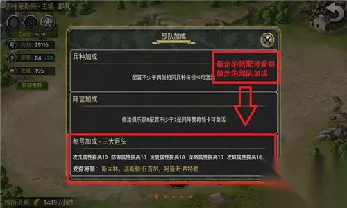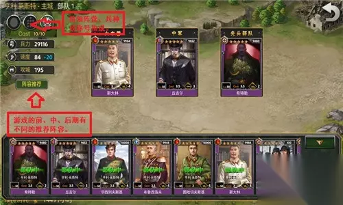 在主界面点击【城市】后,可以对该主城的军队进行配置。配置军队的过程中,除了要注意将领的cost值、攻击距离等因素之外,部分的将领还会获得阵营、兵种或称号等属性加成,还请各位指挥官多多对自己的将领进行研究,以便能够搭配出更具有针对性的将领组合。如果对于将领的组合搭配有不明白的地方,可以点击【推荐阵容】,按照系统所推荐的阵容搭配游戏前、中、后期的组合。