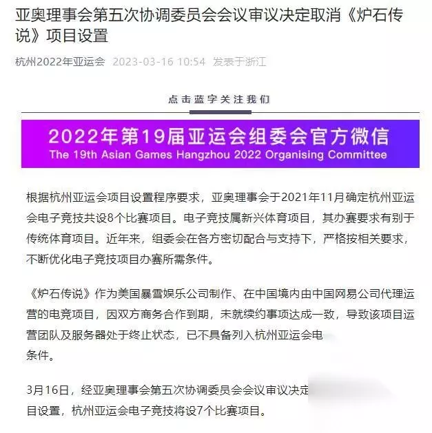 在这种情况下,暴雪此前与网易合作时在中国大陆设置的所有炉石传说服务器已被关闭,并且相关管理团队被解散。无奈之下,杭州亚运会协调委员会第五次会议考虑将炉石传说移出正式比赛项目。 现在据杭州2022亚运会官方消息,炉石传说项目已被正式取消,杭州亚运会电子竞技将设7个比赛项目。 公告原文: 根据杭州亚运会项目设置程序要求,亚奥理事会于2021年11月确定杭州亚运会电子竞技共设8个比赛项目。电子竞技属新兴体育项目,其办赛要求有别于传统体育项目。近年来,组委会在各方密切配合与支持下,严格按相关要求,不断优化电子竞技项目办赛所需条件。 炉石传说作为美国暴雪娱乐公司制作、在中国境内由中国网易公司代理运营的电竞项目,因双方商务合作到期,未就续约事项达成一致,导致该项目运营团队及服务器处于终止状态,已不具备列入杭州亚运会电子竞技项目的前置条件。 3月16日,经亚奥理事会第五次协调委员会会议审议决定取消炉石传说项目设置,杭州亚运会电子竞技将设7个比赛项目。
