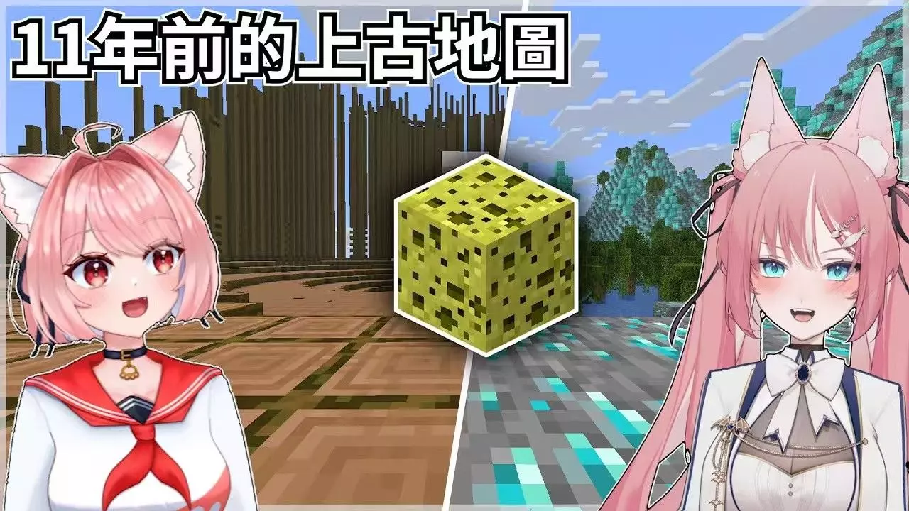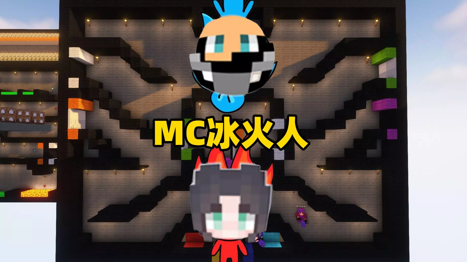 这是《我的世界》的趣味玩法,玩家在MC里体验类似森林冰火人的双人闯关玩法,需分别选定红队火玩家、蓝队冰玩家,协作完成多关卡挑战,图中展示了准备界面和闯关场景。