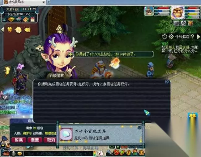 二:百晓星君,NPC在时事通旁边,每天的师门、抓鬼、副本必领,完成这些任务会给你道具,用三药点化,在交还给百晓星君,175有16万经验和1.6万游戏币,还额外给百晓积分,积分可以兑换宝石强化珍珠。