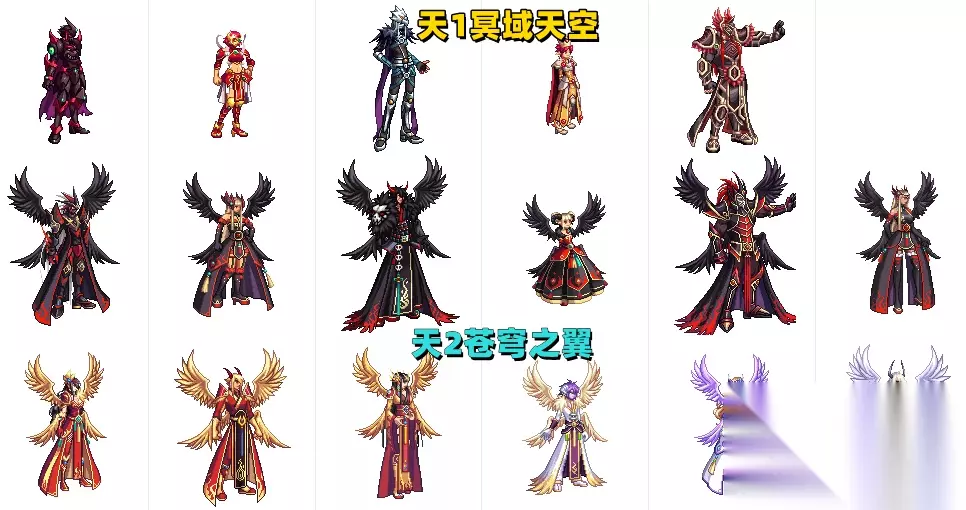 【第2套:苍穹之翼】,从这里开始,“大翅膀”就正式进入地下城范畴了,讲道理地说,当时苍穹之翼推出的时候,火热程度甚至比天1还要高,一眼就能让人看出身价不菲,推荐穿戴职业:男鬼剑、女魔法、男圣职者、男枪、男格斗,感觉这套时装不太适合女职业穿戴,撑不起来。 【第3套:战灵天舞】,迄今为止,国服人气最高的天空套,甚至比天1人气还要高,因为这个系列的天空套,基本上每个职业都有各自风采,而且还诞生了许多后来奉为经典的搭配,推荐职业有:男鬼剑、女格斗、女魔法、圣职者、神枪手等等。