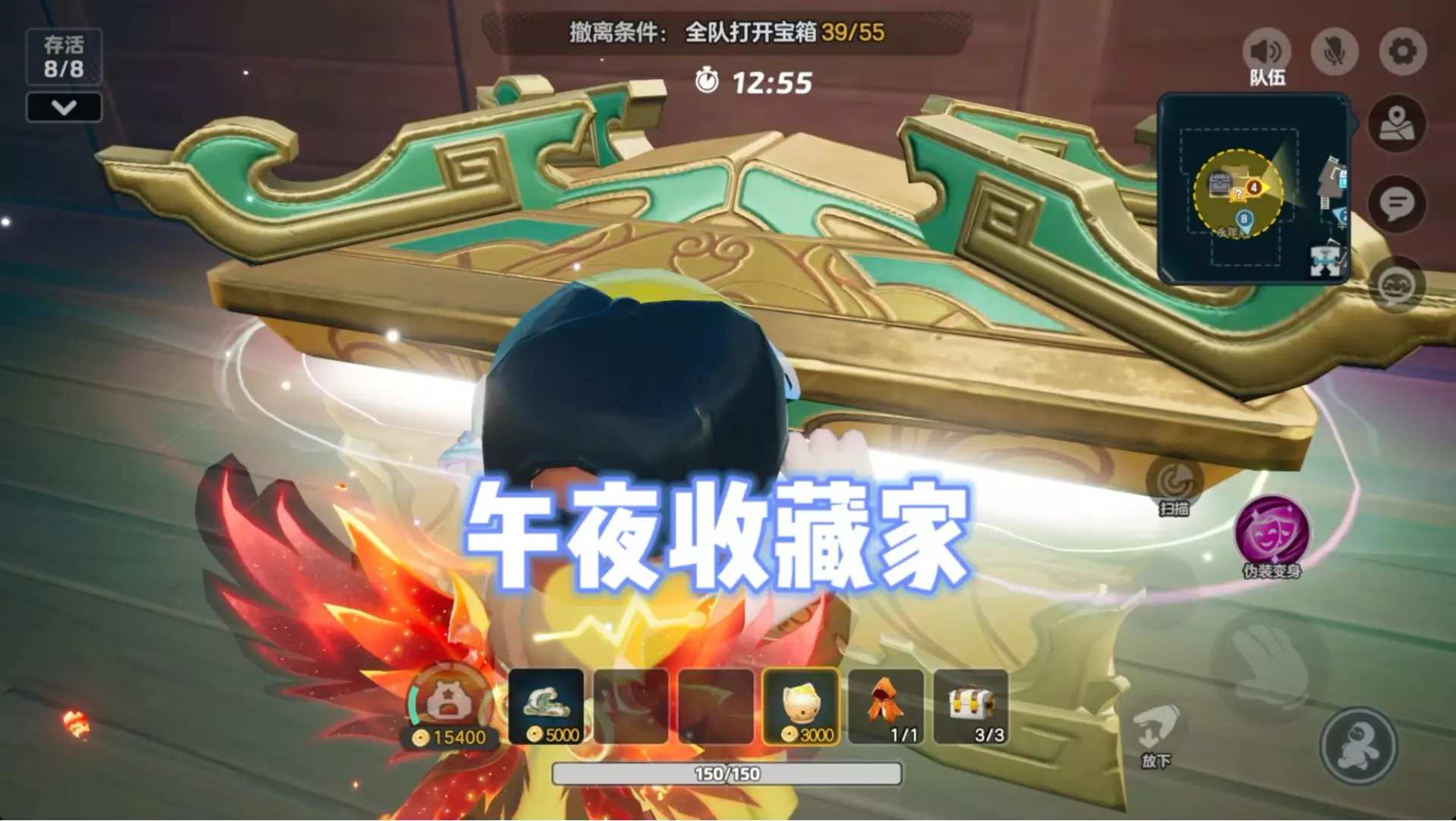 这是《元梦之星》午夜收藏家玩法的游戏内容,玩家在该玩法中开启宝箱收集道具,此次游戏过程中收获颇丰,运气极佳,还能看到角色使用回复汉堡等道具,朝着全队打开55个宝箱的撤离目标推进。