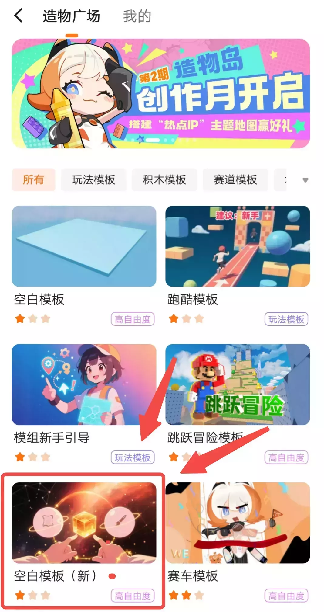 点击创作👉进入造物岛可以看到各种各样的模板,其中就有我们自由度最高的空白模板·新!