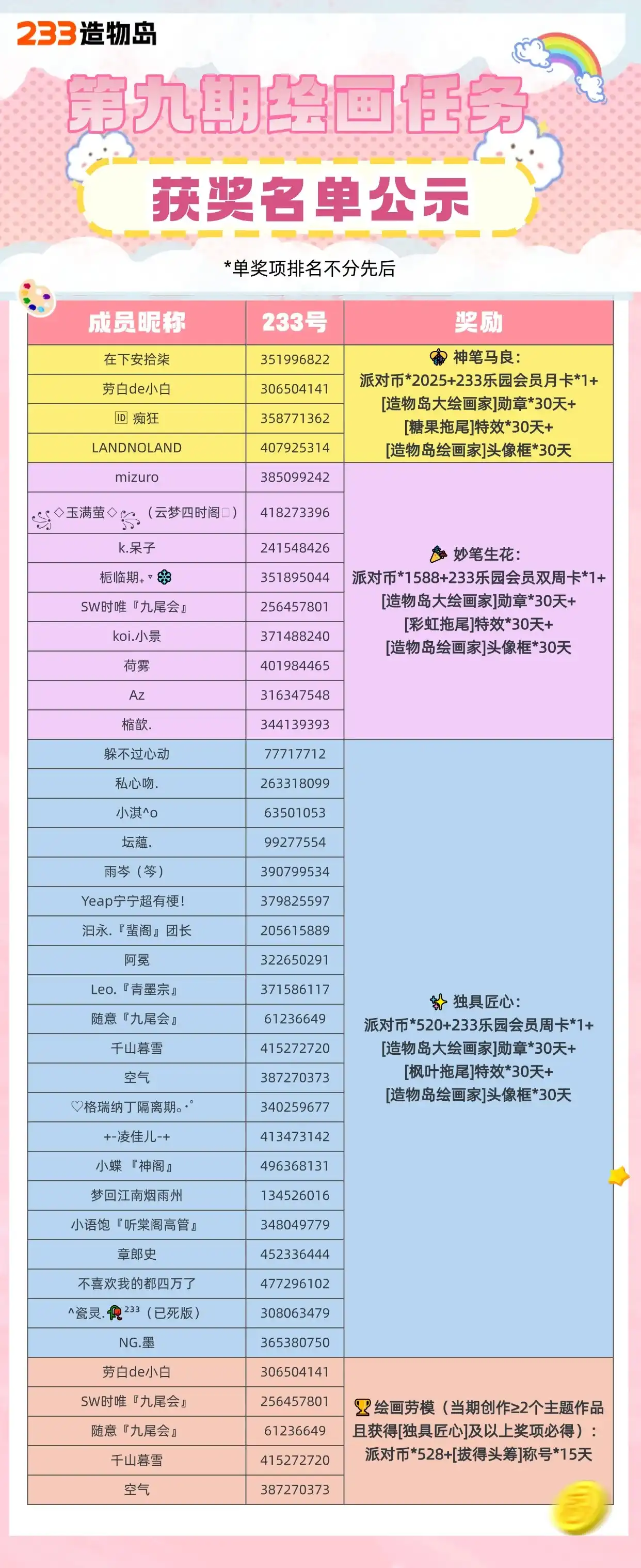 🏆绘画劳模(当期创作≥2个主题作品且获得[独具匠心]及以上奖项必得):派对币*528+[拔得头筹]称号*15天