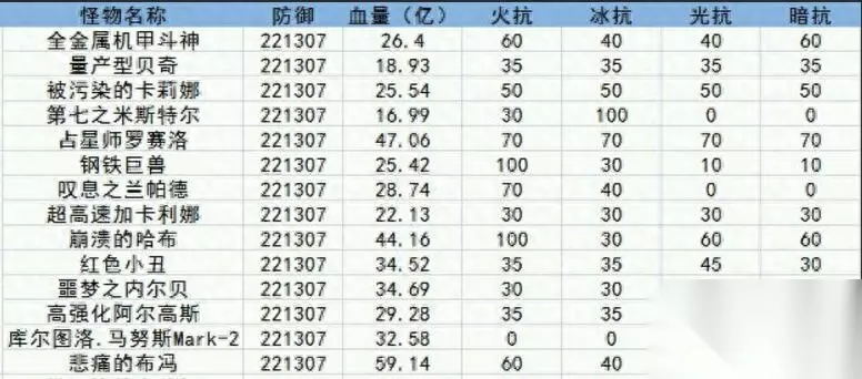 这里仍然需要重点说明一下,建议一阶段将能量装置摧毁,不然二阶段的能量控制室复活时间将会变得很快,具体时间为:如果一个装置都不打,二阶段能量控制室的复活时间为60秒,全打了或者有一两个没打复活时间为120秒左右。 接下来小编给大家列出怪物的各项数值情况: