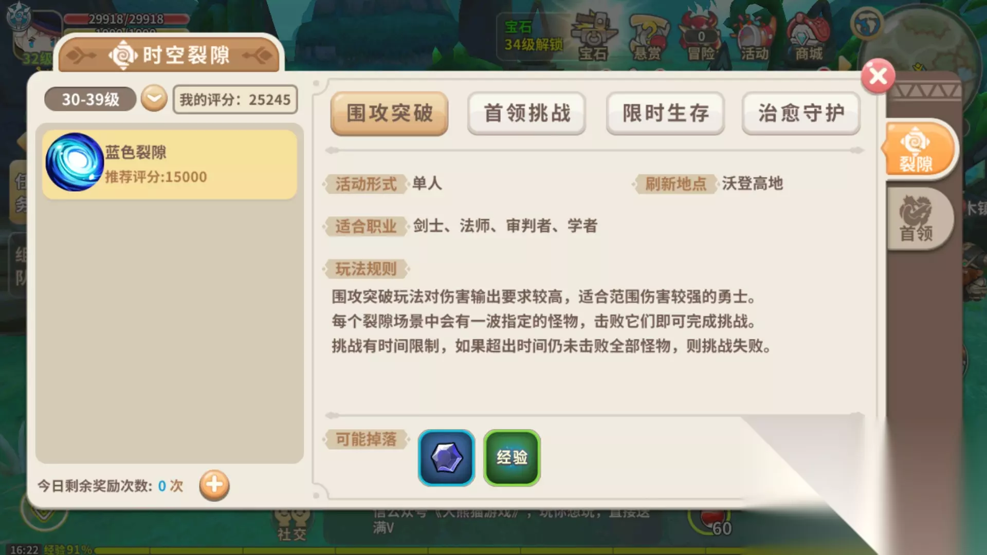 时空裂隙一共有4中玩法,每种玩法对应对不同的职业来说更为轻松,当然如果你时候战力能够碾压一切的大佬,那就当我皮皮骚没说过。 围攻突破:会在指定的场景刷出一波怪物,玩家只要将他们全灭就能完成挑战,如果超时未完成则算为失败。 守灵挑战:场景中会有一只指定的首领级别的怪物,玩家击败它就能完成挑战,如果超时未完成则算为失败。 限时生存:场景中会刷出一波怪物,同时会有两名NPC加入战斗,怪物会不断冲击玩家跟两名NPC,玩家倒下则挑战失败,怪物全灭挑战成功。如果超时未完成则算为失败。 治愈守护:玩法同上,没有太大区别,如果超时未完成则算为失败。