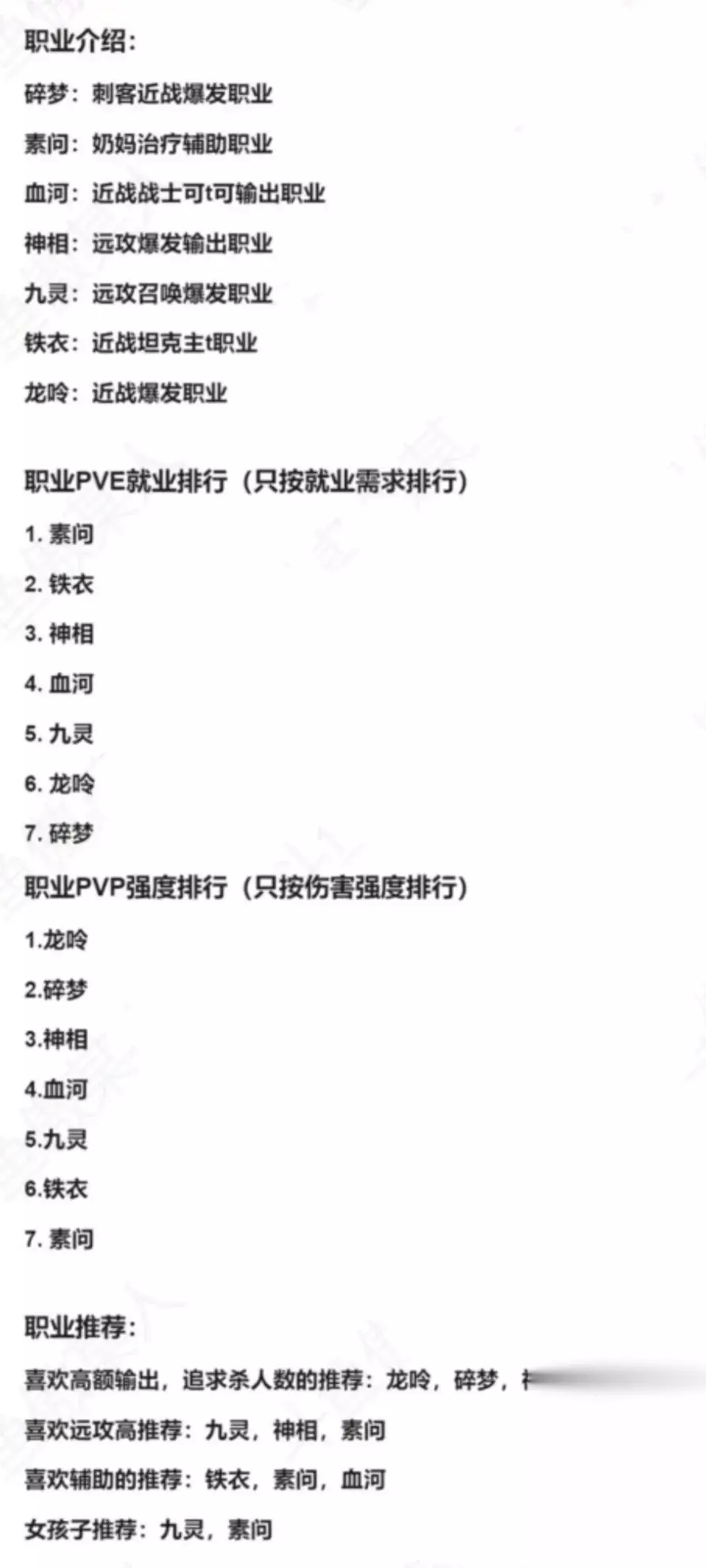 逆水寒手游零氪职业选择推荐 1、铁衣(新手推荐) 游戏内主T。帮战联赛PVE副本就业无压力。3V3战场强度适中,有盾有控制。 比较要注意的就是需要熟练PVE副本机制,毕竟主T需要躲技能,要是死了起来需要拉仇恨。 上手难度一般推荐保护欲男性玩家 2、血河(新手可选) 俗称血河大帝伤害高,坦度也高,六边形战士虽然一般副本中以副T存在能抗能打。 PVP帮派联赛,机动团的主力职业,就业问题不大。 熟练掌握挑刺连招后输出非常暴力。 3、神相(新手推荐) 远程内功输出不论PVP还是PVE都是输出的主力军团不会存在就业困难的问题 手游操作相比端游要简单很多,新手可以哪里亮了点哪里 4、素问(新手推荐) 逆水寒手游中唯一的奶,其他职业奶量太小根本不算! 无论是PVP还是PVE都需求量极大! PVP3V3上分难度大,基本都是拖时间。 素问配铁衣副本横着走 5、九灵 和神相一样属于远程内功职业可以召宝宝。但是在各个环境需求量没有神相大! PVP3V3和战场表现一般需要拉扯。 但是输出并没有比神相低太多。 九灵还是蛮推荐新手的,操作难度低于神相,而且女性角色非常好看! 6、碎梦(不推荐新手) 近战外功PVP联赛和一些特定副本就业空难。野外小规模厉害,偷人很强。3V3表现十分亮眼。其实碎梦的伤害很高但是需要技能连招而且非常脆 7、龙吟 近战内功输出操作难度比碎梦更大,不论在哪个环境都属于就业空难户!