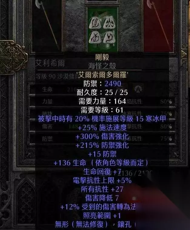 因为有tp的前提下很多时候拉佣兵tp一下就好了。建议选择防御高的。但是由于不带安头了。少了很多str。像是SA+ 7+之类的就放弃了。奈何15edAP+太贵。所以我选择了15ed的海怪。经济实惠。其实重甲也是可以接受的。就是str需求太高了。做的还可以。1.5血27R。打标了。 佣兵武器: 眼光。还是续航问题阿。在没有专职奶爸前提下。靠自己的5bocta还是严重缺蓝。未来和朋友常驻王座看需求可能会做一把无限。当然。无限是最优质的选择了。