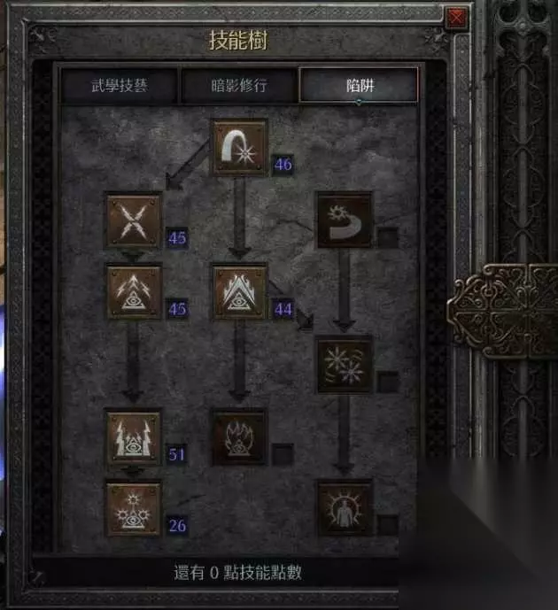 陷阱系优先左边一排加满。王者守卫点一级即可。然后开始加手榴弹及先关。 暗影系爪专精,武器格挡,速度爆发,影散,心灵震爆,是必要的。关于两个召唤影子。看个人吧。如果武器上带心灵震爆mb是极好的。可以省去3点技能点。 --------------------------------------------------------------------------------------------------------------------------------------------------------- 关于佣兵: 我选用的是A2米山大哥。对于光环的依赖程度还是很高的。至于是选择哪种。完全看个人喜好。都有各自的好。我选择的是祈祷型。配合眼光回血N快。(无限当然好。目前没符文做。当然现在也是严重依赖眼光回蓝。1pp续航是问题。因为全图刷。tp飞。对于蓝的需求N多。破电板带上后。觉得低pp无限也没有那么依赖。未来冲等级常驻王座可能会做一把无限来降抗。) 佣兵头的选择: 有很多种。最常见的还是安头吧。安头的好就不在赘述了。但是这里说明一下。我选择的是火头。