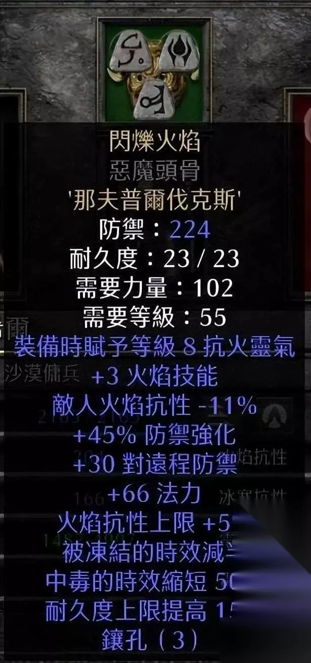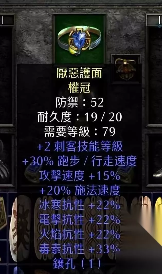 关于施法速度档位的选择:65fcr确保tp档位11F 由于双爪前提下很难到达fcr102档位10F。那样需要带格里风25.项链20.法拳或塔格奥20.双戒指20.技能腰带20.由于好的项链20fcr的也是比较难遇,由于陷阱对于LD的判定导致格里风的-lr属性无用。不如一个好的黄头或者3陷阱20fcr蓝头,军帽,年纪等物品来的实惠。所以放弃。 头环的选择也可以很多种。但是为了20fcr已经全技能和弥补抗性的不足我选择了黄色头环。