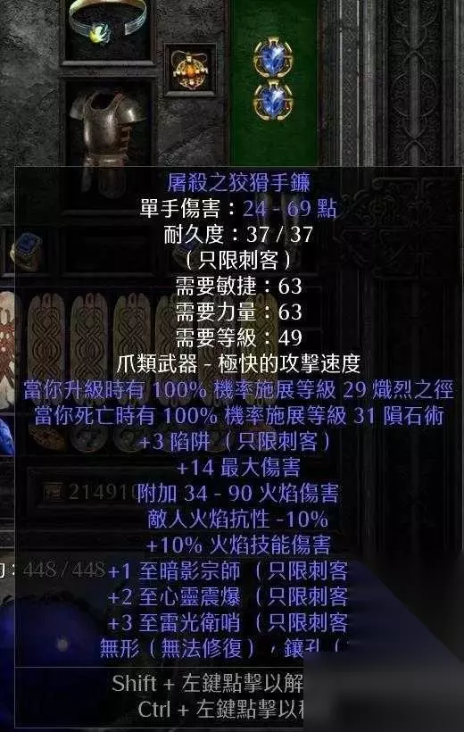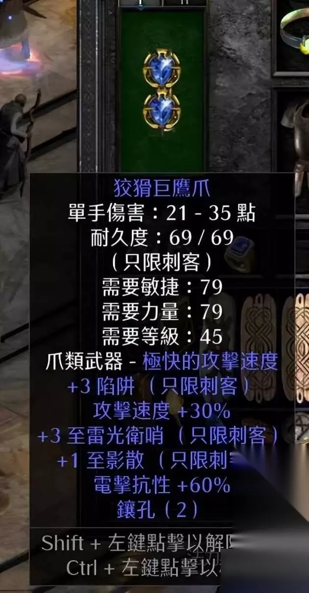2.5版本随着破免板子的推出。让陷阱刺客在没有或不用无限的前提下变的更加可玩和友好。以及亡者守卫的改动。可以丰富火系手榴弹的伤害。关于版本和技能的更新这里就不赘述了。论坛里有好多大神贴可以翻阅。 人物各项指标的目标: 关于攻速:确保开影散下,释放陷阱达到9F急速。 主手武器使用巨鹰冷静爪2sin15ias R或lr珠宝。因为带了破免板子-70的电抗有点多。所以我选择15ias30lr的珠宝。确保了30ias前提,弥补了电抗。 副手武器使用有两种选择。 一为低需求底材做的瘟疫爪。3ls前提下技能丰富就好。确保了5ls和净化光环。这个净化光环非常之安逸。用了都说好。 二为冷静爪,低需求2sin55火猪为前提。再有丰富的技能就更好了。 关于武器,也可以双瘟疫。或者主手瘟疫副手冷静爪。毕竟好的主手爪子可遇不可求。武器搭配方面的宗旨是影散前提下9f急速释放陷阱。 附上武器图: 主手武器: