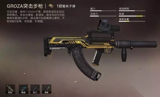 意思就不多解释了,单排你见了必拿枪。莽夫专用,大神专用。建议全息,扩容必备,每秒dps667全部枪械中排第一。 排名第二:GROZ,学名“狗杂”,DPS为600 狗杂是一把突击步枪,枪口只能配消音。大众都喜欢的一个枪械。