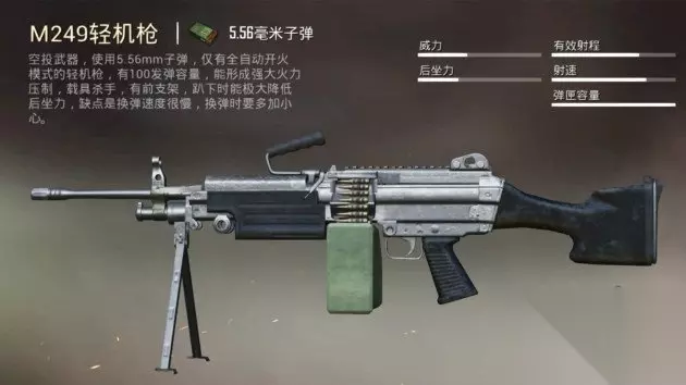 标签:近战神器、爆发无敌、声音舒服、无懈可击、后座就不谈了。 排名第三:M249,学名“大菠萝”,DPS为573 大菠萝应该属于重机枪,但是和平精英把它定义为轻机枪。伤害高,后座低,子弹多,换弹慢。