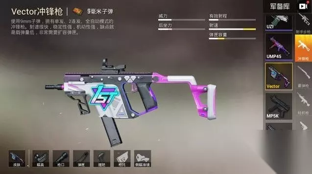 标签:灭队神器、换弹癌、换弹恐惧症、爆破专用、扫车专用、伏地恶魔。 排名第四: VECTOR,学名“维克托”,又名“短剑”,DPS为564 维克托拥有极致射速,35发子弹容量。冲锋利剑,可控性有点低。