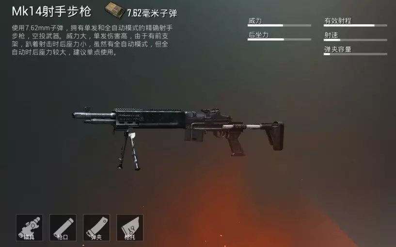 标签:近战神器、冲锋利器、短小精悍、准的恐怖、腰射之王、攻楼神器、爆发神器、单挑无解、扩容支配者。 排名第六:M762,学名“762债王”,DPS为520 步枪中射速恐怖,伤害恐怖,后座恐怖。 标签:近战神器、爆发神器、后座飞天、大神专用、垂直控、配件控、伤害控。 排名第七:AKM,学名“AK”,DPS480 刷新率极高、大众都喜欢的通用型枪械。 标签:近战神器、爆发神器、后座无解、通用之王。 排名第八:AGU,学名“空投废物”,DPS为477 AUG有着出色的稳定性和射速,换子弹速度慢,秒伤还不错。 标签:中距离之王、最稳556、土豪专用、换弹癌、快扩支配者。 排名第九:M416,学名“M4”,DPS为477 M4不过多解释。 标签:中距离之王、最稳556、通用之王。 排名第十:scar L ,学名“死尬” ,DPS为447 scar L是M4的低配版,但是稳定性略高于M4,射速略低于M4。 标签:中距离之王、最稳556、通用之王。 总结: