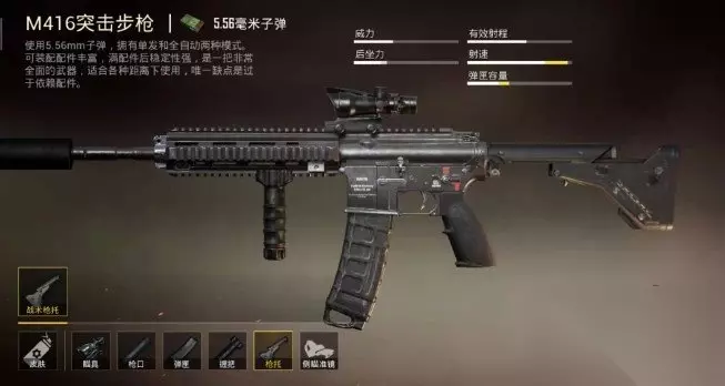 3.M416步枪 M416这把枪算得上是步枪的楷模,被大家誉为“万金油”,满配的M416绝对是可以为所欲为,无论是用来打敌人还是用来吃鸡,都是非常稳定的,中近距离可以说是非常无敌,这把枪在大多数玩家心里都可称上一把好枪。