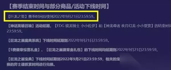 3:可以在官网2022年8月24日发布的2.16版本 8月25日更新公告得知:巨龙之巢赛季时间持续到2022年9月21日23:59:59; 4:这次的更新羁绊改动还可以,删除了不少的英雄,当然也新增了不少的英雄,装备方面也有部分的改动。