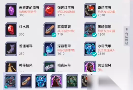 在装备选择上,建议第一件优先憋出黑暗翡翠,因为它的合成路径中包含了辅助专用的未鉴定原石,能够持续为乔巴提供金币,在缺少兵线和人头经济的情况下,能为乔巴提供良好的经济支持,从而确保它能及时更新装备,并且黑暗翡翠还有一个给队友加盾的效果,配合乔巴本身超强的控制能力,可以更好的保护队友。 鞋子的话则可以选择驱魔草屐,它主要是能够减少被控时长,从而提升容错,让乔巴可以不必因对手的控制而错失放技能保护队友的时机,后两件的话需要再出冰霜战甲,冥想披风提升乔巴的整体坦度,第五件再补出生机之甲让乔巴能够脱战回血保障续航,最后再补一件奇运宝石为队友提升防御,进一步保护队友的同时,也让黑暗翡翠的护盾更有质量。