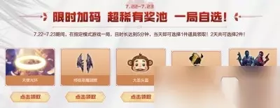 4、7月22-7月23日还会有加码活动; 5、游玩指定模式5分钟以上即可领取,两天各可以领一次;