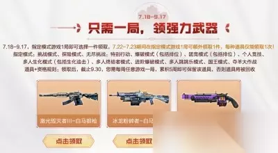 《CF》魔花冰龙套稀有返场活动2023一览 1、在7月18日-9月17日,游玩如下图指定模式,可以领激光毁灭者Ⅲ-白马银枪、冰龙粉碎这-白马银枪、神圣爆裂者Ⅲ的其中之一; 2、7月22日-7月23日游玩指定模式可额外领一把武器;