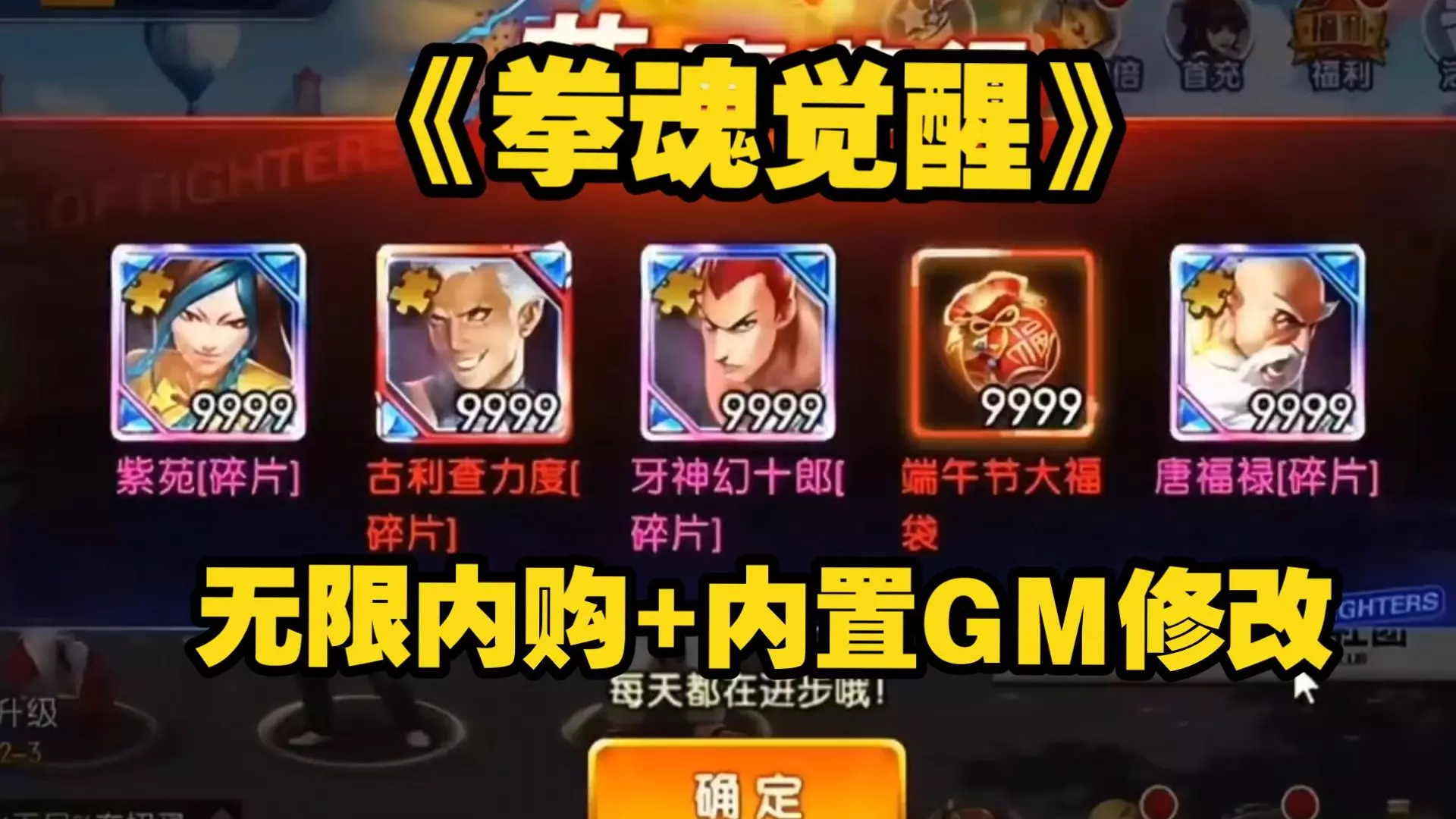 这是拳皇IP手游《拳魂觉醒》的福利宣传,其内部福利端口持续开放,商城物品全赠送,游戏内有邮箱、扭蛋机、拳皇争霸等玩法,还可获取宝石、印记等道具,能享受丰厚福利。