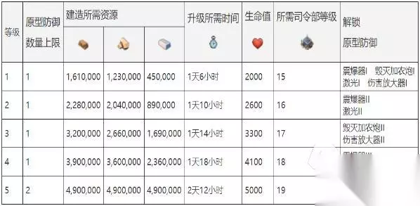 原型防御设施:震爆器、伤害放大器、机械飞爪、毁灭加农炮、护盾发生器、激光、高压喷火器、西蒙狙击塔、防空护盾、微波烤炉、诡雷火炮、惊喜双管炮。这些设施是等玩家达到15级之后才能建造的,优先建造武器实验室,后续就只需要不断地获得相应素材,就能生产出该设施,但顶多只能安放3个。 防御类设施:追击炮、狙击塔、重机枪、加农炮、火焰喷射器、火箭发射器、震爆火箭炮、巨型加农炮;