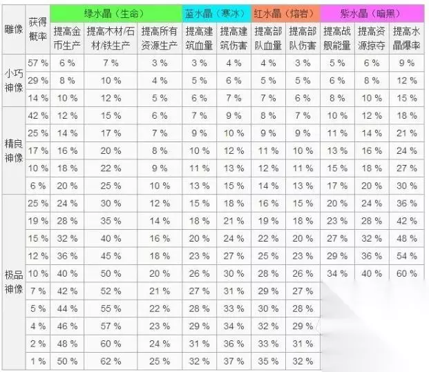 神像分别就有生命、熔岩、寒冰、暗黑的四大神像。该神像只需等到司令部5级以后即可解锁,如果备用的资源也足够充分,那便可以最多安放到10座神像。