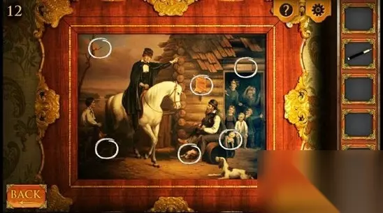 7、点击墙上的画,找到与照片上的不同处,依次用钢笔点击,上图白色圆圈所示6处地方。