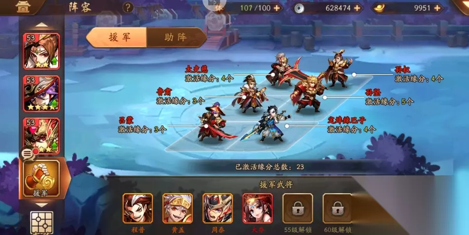 吴弓流主打持续输出与控制,核心成员包括孙坚、程普、甘宁、黄盖、太史慈,搭配步练师、孙尚香、甄姬,军师选择周瑜。这套阵容的特点是控制与续航并重:孙坚、程普、黄盖提供迟缓、眩晕等控制效果,有效限制敌方行动;太史慈、孙尚香作为主力弓手,在周瑜的弓手增伤天赋加持下,能打出稳定且范围可观的伤害;步练师和甄姬负责治疗,保障阵容的持续作战能力。在持久战或对抗高爆发阵容时表现优异,通过控制效果逐步消耗敌方资源,最终以持续输出取胜。