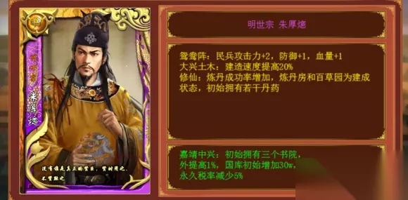 紫卡 明世宗 朱厚熜 1.鸳鸯阵:民兵攻击+2,防御+1,血量+1 这个技能相当于把民兵小白拉到了与步兵完全相同的水准,有的人可能会说民兵很废,这个技能没用。我认为并不是这样的,前期能组其来的非民兵部队就只有弓箭兵,步兵和轻骑兵,弓箭兵10力基本上是没有人用的,步兵11力也好不到哪里去,所以其他皇帝卡一般采取轻骑兵14力开局。但为什么不用步兵开局呢,因为步兵=甲胄+朴刀,骑兵=战马+朴刀,我花一点战马比甲胄多的钱换取3力,何乐不为呢。但鸳鸯阵完全改变了这个情况,前期买的装备攒下来后期用,前期采取民兵阵攻下日本琉球西夏等小国(有些小国留着臣属也行,看个人情况)只减少3力,剩下买马和刀的钱,用来渡过艰难的前期。 3. 修仙:炼丹成功率增加,炼丹房,百草园为建成状态,初始拥有若干丹药 4. 嘉靖中兴:初始拥有三个书院,增加1%获得名臣概率,初始国库增加30w,永久税率减少5% 两个技能合起来看,送的三个书院是岳麓 白鹿洞和石鼓书院,兼顾了一般大臣和名臣。而百分之一名臣几率,我们当做100次加1次,一年出去祭祀是11次科考,相当于9年多出1个,也还算能看吧,但是关键是开局送两个名臣书院,这就不得了,大大增加前面刷出名臣的几率。 炼丹成功率,没有几率,不做讨论,总体等于延长寿命,也是不会差的,初始的丹药我开一局大概是10副左右,也是不错的。 最后分析送的五个建筑,总工程量比演武场略低一些,并且不加在经济,而加在丹药和名臣上,注定前期艰难,而最沉重的打击是永久税率减少百分之五,只让初始的多加30W显得杯水车薪,总之一句,注意破产。 2. 大兴土木:建造速度增加20% 非常imba的技能,节约了百分之二十的工匠,几乎所有固定数值,我们可以认为前期发力,而百分比数值,认为后期发力(正面技能)所以前期效果还不能说是非常明显,但是后期有多强,你用用就知道了。 总评:7.5分 可以说是加入了一些个人的感情分,明世宗不适合新手玩,容易前期崩盘,所以前期要节衣缩食,少买武器,但民兵的强力又恰好弥补了这一点,可以说是设计的环环相扣,只需要渡过艰难的前期,中期靠名臣发力,有充足的丹药,完全可以撑到后期,后期基本是不缺钱的,减少的那点税率也不足挂齿,就是你的天下了 总体而言,是设计的很好的一张卡,需要一定的操作性和对游戏的理解。