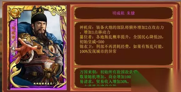 紫卡 明成祖 朱棣 1.神机营:装备火炮的部队额外增加2点攻击力1点移动力 前面说过移动力是比较没用的一个属性,那么我们就当这个属性加2点战斗力,对比一下铁血差距就很明显了,首先不是所有部队,而是装备火炮部队,很明显就比较后期了,但是在后期里面,加攻击力是最好的一种属性,因为后期攻下许多州府,不愁壮丁,加之作战医庐的修建,相对不怕死兵,而名将经过十几几十年的积累也达到一定的程度,发动计谋概率增高,因此,作为一个后期的技能,加了2点后期最需要的属性,总归还是不错的。 2. 篡位者:提升各地叛乱几率,各地民心降低20,初始皇威增加500 3. 锦衣卫:刑部不消耗经费,一定发现叛乱异常 两点合起来说,先说民心,民心就目前版本而言是比较废的一个数值,因为在70以上的时候民心是会逐步往上升的,那我们要怎么把民心弄到70以上呢,很简单。现版本的机制决定我们的操作是在1、4、7、月进行强征,而其他8个月免税,基本只要一两年左右,民心就稳定在100了。 而其他三项都是围绕叛乱进行,但总体而言也用处不大,叛乱的主要原因还是野心高,只要我们勤于科考勤于找人,勤于换下野心高的地方官员,基本是不会出现叛乱的,而且叛乱又不是丞相叛乱,不还有你们最爱的sl大法吗 4. 万国来朝:初始敌国敌意值降低20%,贡品随机增加,商业增加100,贸 易请求必定成功,贸易收入增加30%,初始国库增加150w。 敌意值降低配合皇威增高基本是稳如泰山,贡品增加其实变相提高了名臣属性(赠送名臣)商业加100等于农业100(以后所有智能建设项目+100当作一个演武场)必然也是很强的,贸易请求必定成功,可以节省我们几个回合的软磨硬泡时间,前期贸易收入大概是每个三四十万的样子,如果按照12个国家算,并且亏掉其中三分之一,一年赚300万,三分之一是一百万,大概等于多出一个季度的税收,再配合开局的150万,渡过前期也是基本没有问题的。 总评:7分 还是中规中矩的卡,23技能个人认为聊胜于无,前期靠4技能后期靠1技能吃饭,新手老手都好用