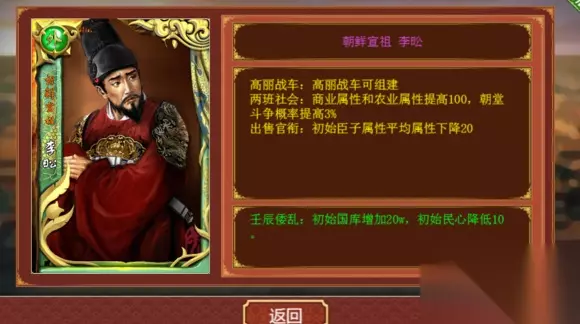 绿卡 朝鲜宣祖 李昖 1.高丽战车:组建高丽战车 高丽战车面板数值和铁骑相同为24,但是训练度要求降低10点,并且减少1点移动力换取攻击力,在硬实力上比铁骑稍强一点,不过也就那样吧,而且是后期兵种。 2.两班社会:商业农业属性+100,朝堂斗争+3% 这个技能给一个绿卡就Imba了, 强如朱元璋和朱棣不过是各给100,这直接两个各给100,等于送2个演武场。前期经济会很好,比起来朝堂斗争的3点算什么呢。 3.出售官衔:初始臣子平均属性降低20 负面技能,但问题不太大,最多不用初始臣子。 4.壬辰凌乱:初始国库+20w,初始民心-10 一正一负抵消,影响不大。 总评:4分 个人认为是很强的一张绿卡了,只要还是靠两班社会撑起前期的经济,后期靠战车爆发,衔接也还算连贯,不比崇祯差多少