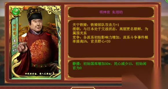 绿卡 明神宗 朱翊钧 1.关宁铁骑:铁骑攻击+1 作为最后期的兵种,只加1点战斗力。。太不够看了吧。 2. 援朝:与日本交战,臣属朝鲜 不知道是不是现版本的bug,我之前开的一局和朝鲜显示的不是臣属而是联盟关系,和日本也不是交战。。 如果修复之后,按照字面上的意思,多一个属国必然是好的,但是鉴于高丽是友善,也不好随便索要把好感弄下去,所以用处不大,和日本交战还是不大好的,虽然说日本是必打的,但是如果开局就交战的话,各位大佬难道要拿初始的12万兵来抗吗(尤其是高难度) 3.党争:派系影响力增加,斗争概率增加5%,官员野心+20 完全的负面技能,官员野心+20还是幅度较大的,基本上等于初始的臣子都废了。 4. 静摄:国库+50w,民心-15,初始闲官0 前朝臣子废了不说,还没有闲官可以换。。不搭配点名臣卡或者是吏治考成可能要死在前期。 总评 0分 如果不是约定好不给负分我可能不知道自己会做什么,但是卡总得有好有差吧。。没有差的卡怎么凸显出好卡的好。。唯一的正面技能是后期的,所有的负面技能是前期的,这是一个比崇祯皇帝还难度过前期的皇帝,曾经看到有人说裸开一局都比这个强。我只能说,希望大家有挑战难度的勇气