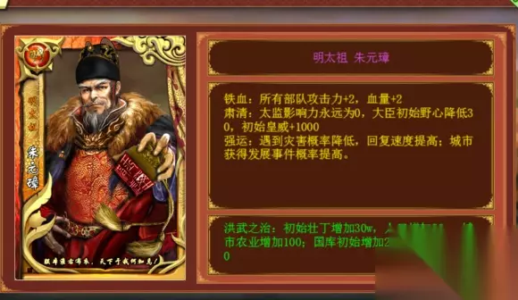 金卡 明太祖朱元璋 1.铁血:所有部队血量+2,攻击+2 这个能力确实很强,点到组建军团,我们可以看到每个兵种的战斗力,而里面的切换显示选项我们可以看到战斗力分别是由攻击力、防御力、血量和移动力四项数据相加得和。然而在这个游戏中移动力是比较没用的一个属性,因为前期我们没有能力支撑长途奔袭,后期也可以通过多支部队分头进军来弥补,而铁血技能不加移动力,而是加了4点硬的战斗力,4点相当于升级了,比如1级骑兵14 2级骑兵18,不再列举,所以这个能力毋庸置疑前期后期都是爆表的。 2. 肃清:太监影响力永久为0,初始大臣野心-30,初始皇威+1000 太监影响力个人认为并不太重要,各个势力影响力其实可以通过清理影响大的人员来得到解决,不再赘述。初始大臣野心-30也就算是一般,因为初始的大臣往往聊胜于无,唯一好的地方就在于你可以用一些名臣卡,这里面的名臣如果野心高的话可以相互抵消一下。皇威+1000就很Bug了,基本上前期被打的概率降到比较低(不考虑SL) 3.强运:遇到灾害纪律降低,恢复速度提高,城市获得发展事件几率提高 这个概率没有写出来,所以具体也不知道是多少,但总体是为前期服务的。降低前期崩盘的可能性 4.洪武之治:初始壮丁+30w,人口+50w,城市农业+100,国库初始+200w,民心+20 这个又比较imba了,自由模式开局壮丁满员也就100W多一点,直接多了四分之一的壮丁,开局工匠是不用愁了,农业+100的一个什么概念呢,每次智能建设+1-5不等,此处取平均值3那么加100就等于剩下10个州府33回合智能建设,也就是330万壮丁的工程量,而我们知道演武场的工程量是324万,而开局直接送,节省掉了建设时间,和建设演武场时间相抵消,所以这个能力基本等于送一个演武场。国库+200W大概相当于开局3个季度的税收,民心是比较废的一个属性,讲到其他卡时再做点评。 总评:9分 没有什么特色的能力,但至少没有负面效果,数值都很硬,注重前期,适合新手,一般不要作就不会死,但是后期就聊胜于无了,所以只能说是一张中规中矩的橙卡,希望新版能看到一些更强,或者说可操作性更强的橙卡