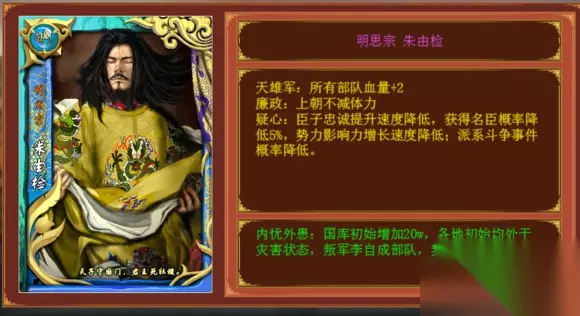 蓝卡 明思宗 朱由检 1.天雄军:所有部队血量+2 所有部队+2,无脑的一个好技能,不多分析 2. 廉政:上朝不消耗体力 如果我没记错的话上朝一次减15点体力,效果中规中矩,可以省下一些体力用来读书,然而。。。 3. 疑心:臣子忠诚提升速度降低,获得名臣概率减小5%,势力影响力增长速度减少5%,派系争斗概率降低 前期的节奏一般还是下朝之后以读书为主,刷孩子为辅,再找一些固定NPC什么的,当然读书的唯一作用就是刷名臣,你这一下减掉5个百分点怎么刷。。 只能前期带一些强力名臣卡来挽救一下,不然怕是第一波仗没有名臣打。派系斗争之前分析过了,当前版本用处不大,并且可以通过清理官员来调整。一般派系斗争的最坏结果就是把人弄到牢里或者弄死了但是大臣的话,如果是属性不好的大臣,弄死又有钱还有皇威何乐不为 这很邪恶。名臣的话。。不还有你们的SL大法吗。。名妃同理 4. 内忧外患:初始国库+20w,各地初始为灾害状态,出现叛军李自成部队 灾害状态基本就靠丞相了。。搭配个名臣卡处理一下,不过基本上20W还是不够看的。。李自成占据河东河北,初期少两个城还是挺要命的。 总评:4.5分 基本上就只能靠天雄军吃饭了,和名臣无缘加上开局的艰难让崇祯皇帝在高难度下必然是步履维艰